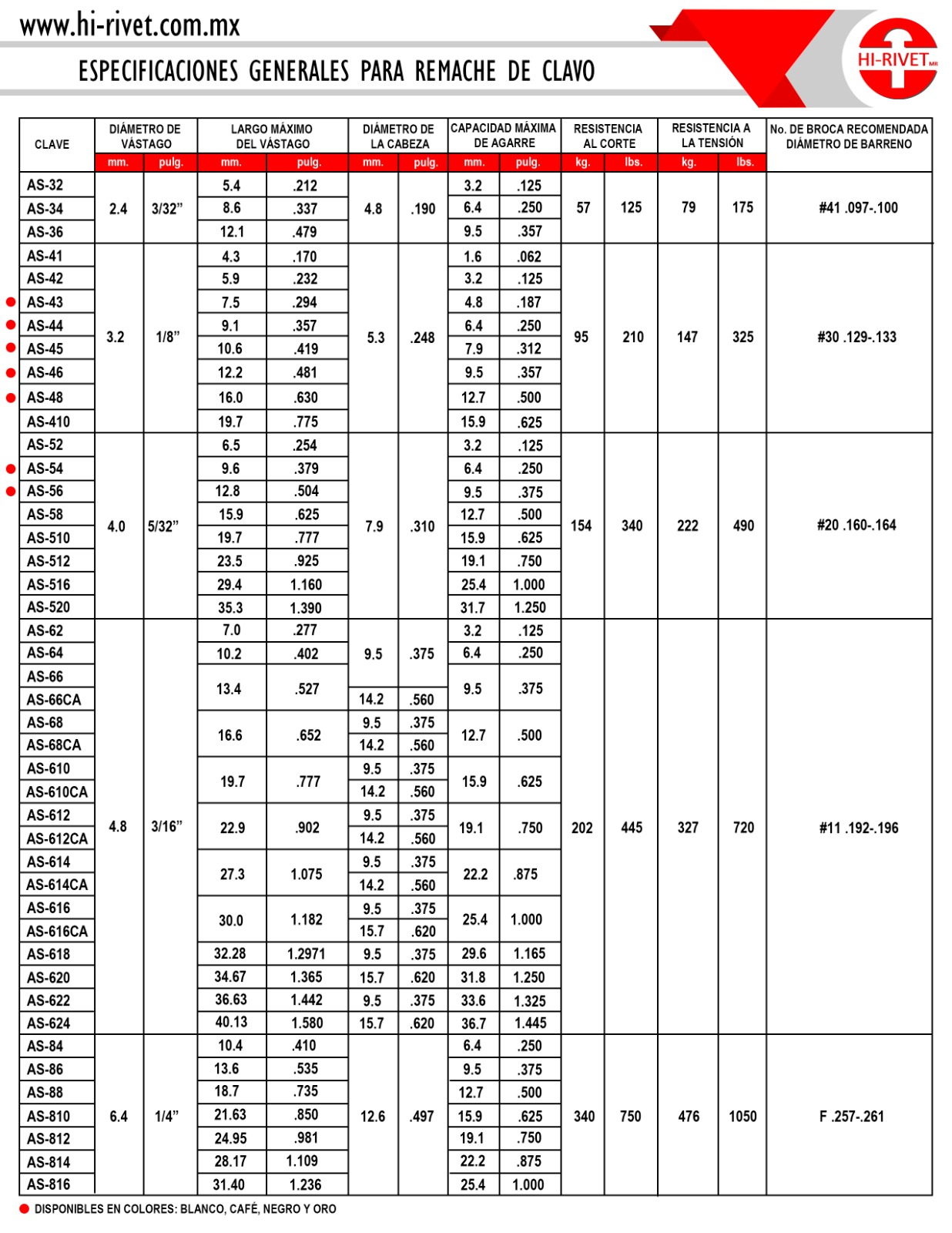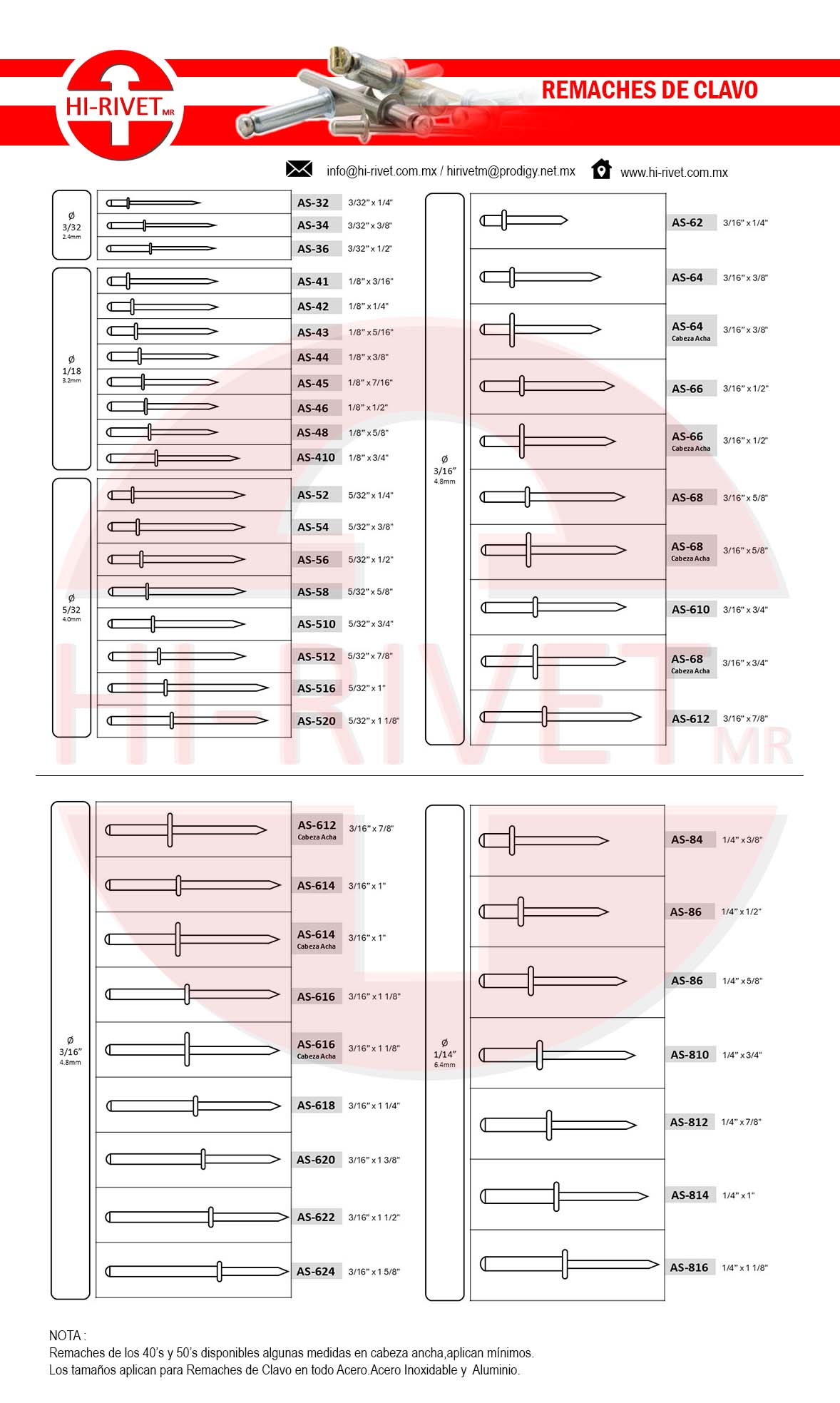 Para materiales más suaves se sugiere crear una superficie de soporte mayor con un remache con "cabeza ancha", o bien coloque una rondana para ayudar a absorber el impacto de la instalación. Si requiere de una superficie más plana, escoja un remache con cabeza plana embutida, si el remache va a estar en contacto con alimentos o expuesto a la humedad o corrosión excesiva escoja remaches de acero inoxidable.