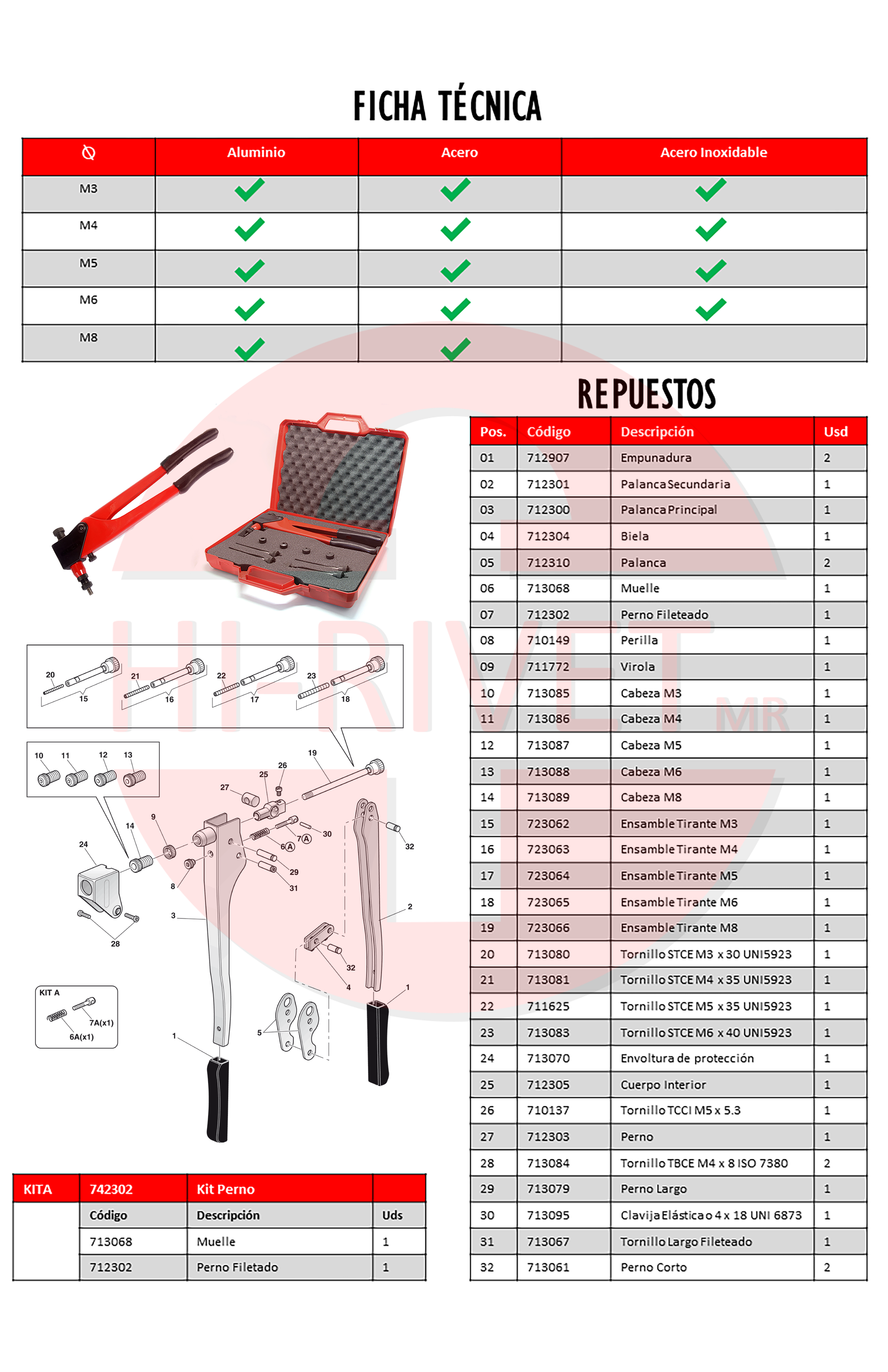 Descripción: Remachadora para aplicar tuercas inserto remachables en rosca milimétrica M3, M4, M5, M6, y M8. En casi todos los materiales.