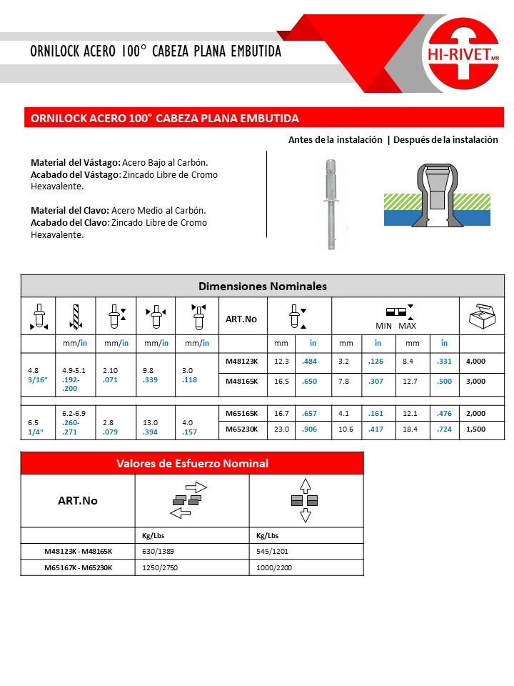 ORNILOCK ACERO 100° CABEZA PLANA EMBUTIDA