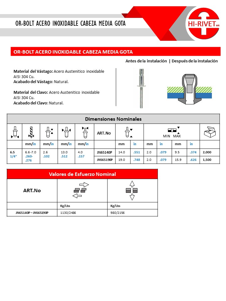 OR-BOLT ACERO INOXIDABLE CABEZA MEDIA GOTA