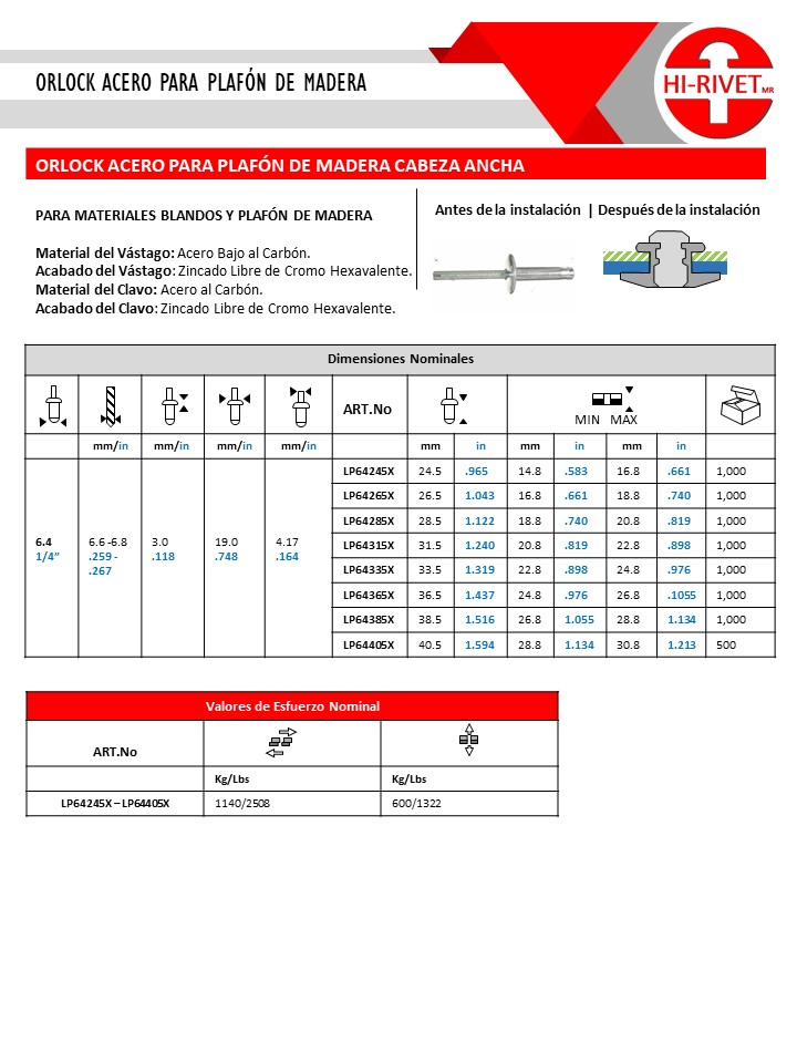 ORLOCK ACERO PARA PLAFÓN DE MADERA CABEZA ANCHA
