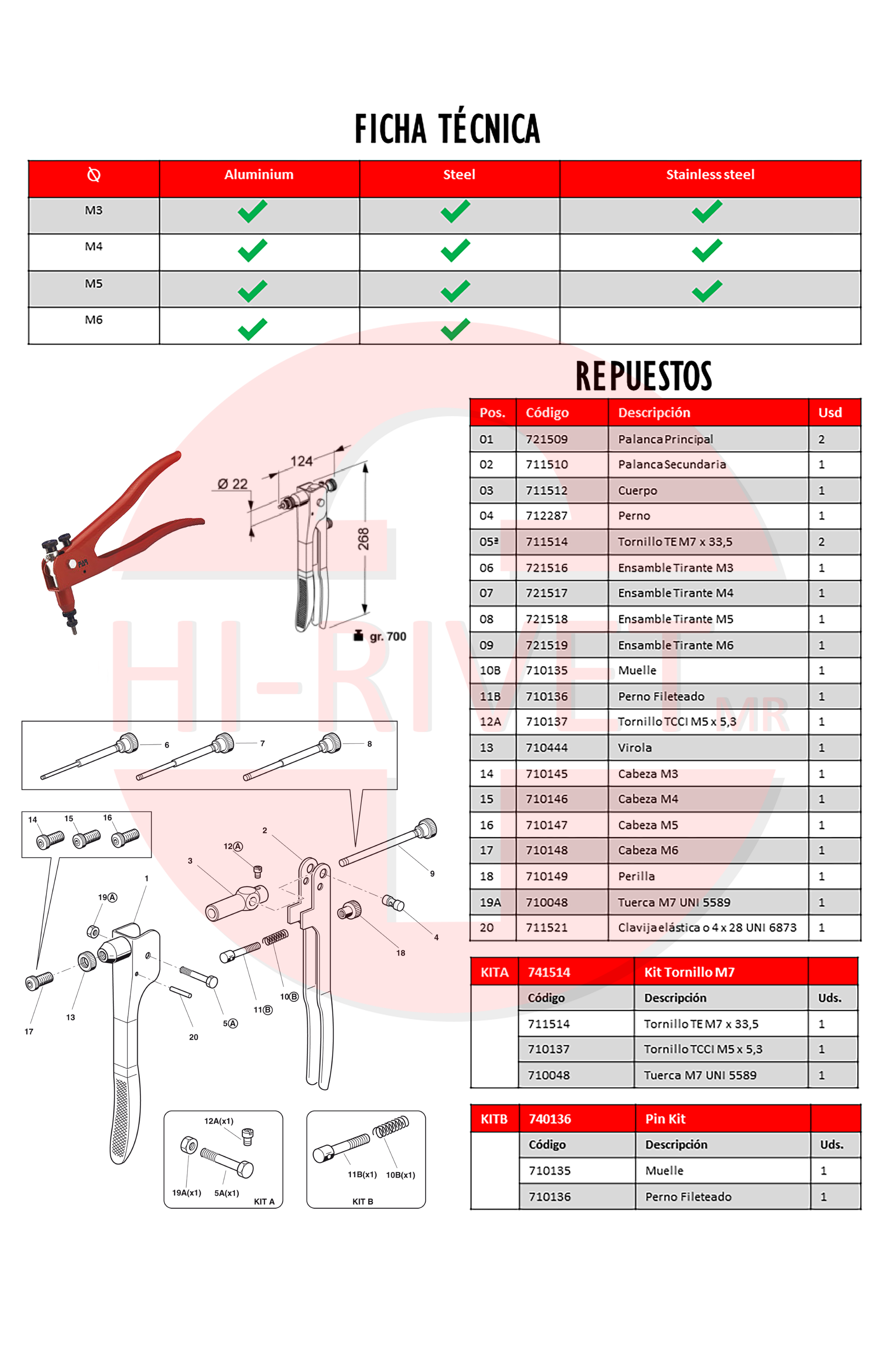 KJ17 Pinza Remachadora aplica tuerca Inserto milimétrica desde M3, M4, M5 y M6 y estándar 6/32", 8/32", 10/24" y 1/4".